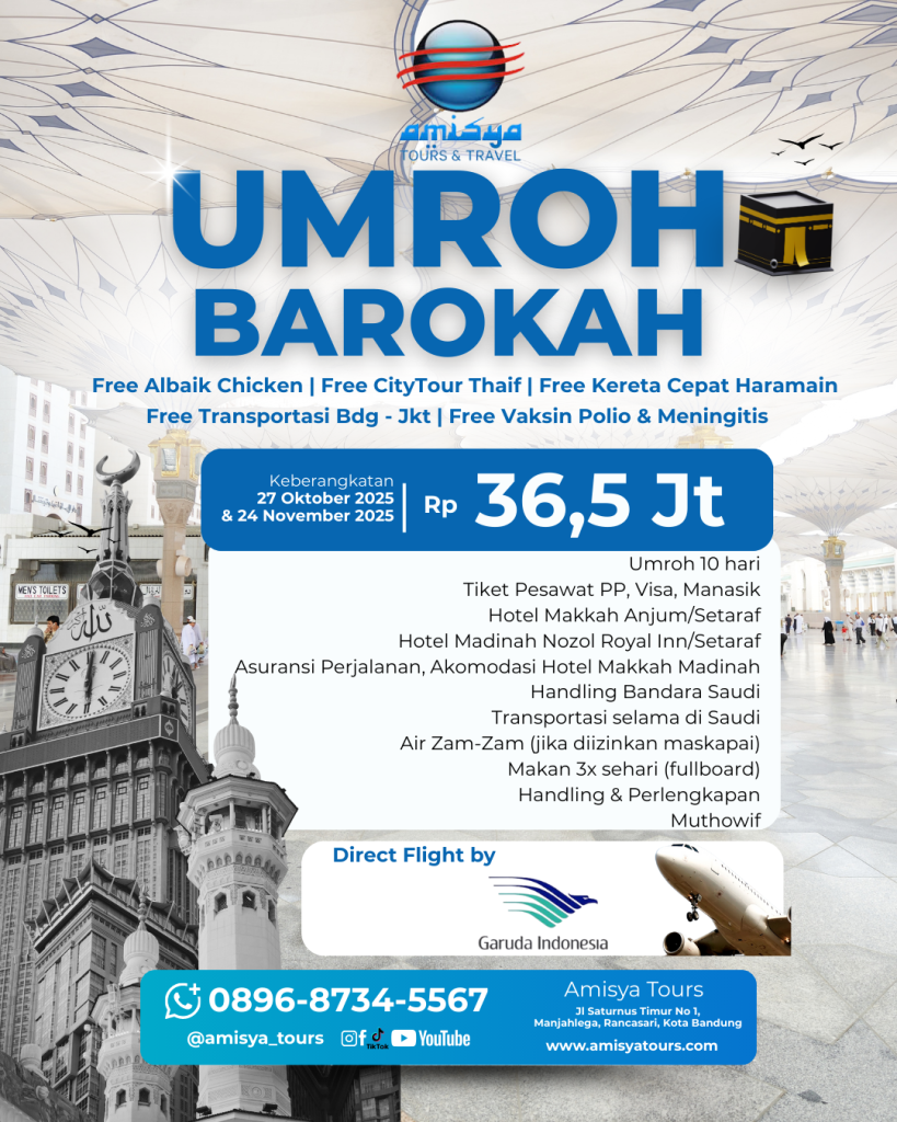 Amisya Tours & Travel telah berpengalaman dalam memberangkatkan jama’ah ibadah Umroh & Haji Khusus. Kami sangat menjaga kepuasan dan kepercayaan jama’ah dalam melaksanakan ibadah Umroh dan Haji Khusus.